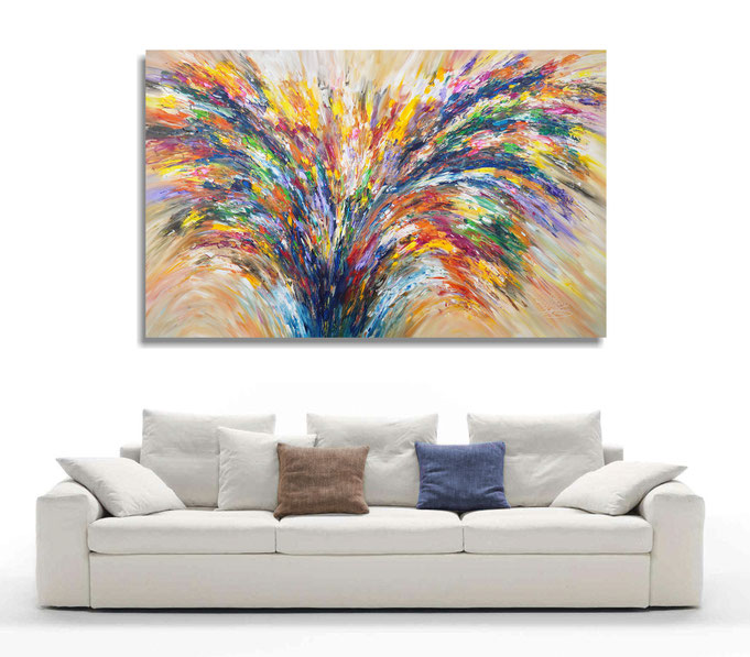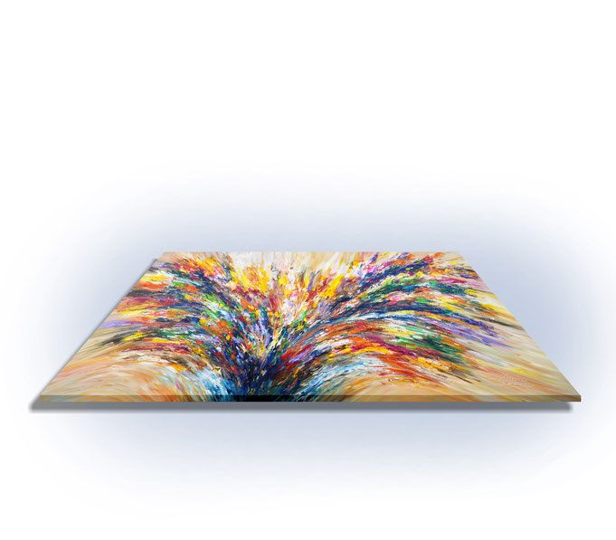 The extra-large format is one of my favorites when painting... here's an abstract, highly expressive painting. The colors unfold as if from an ascending formation: blue, green, lilac, violet, magenta, yellow, white, orange, pink, red, beige, and brown. A dynamic and positive image that invites the interested viewer to discover the many details and allow positive thoughts and feelings to flow freely.